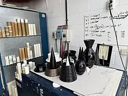 "I discovered commercial stains, industrial techniques; I started working with porcelain, using an electric wheel and firing with electricity. I'd always been interested in starkness, and the purity of form and control and in black and white. Firing with electricity at college gave me the control that I'd been battling against in the cone 10 reduction syndrome. Now I could eliminate random flash effects; I even started to spray glazes."[4]: 58