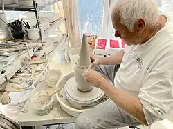 Most of the shapes I work in go against the natural organic tendencies of clay and gravity. You have to make up new techniques to get what you want. I will use anything to aid the process of getting there. I am very Machiavellian when it comes to masking tape and string. I tend to throw blanks as finely as I can and severely turn them into the precise shapes I intend. I use metal kidneys most of the time and work on any surface I can reach. I stretch and coax rather than throw shapes. Bowls are always turned inside and out. I am not interested in the random and the spontaneous. I want to be better than a lathe, more plastic than plastic. I have a considerable failure rate at all stages of the process. If you are not losing work, you know you are not pushing things far enough. I like working on a tightrope and in areas I don't know anything about.[5]: 72, 74
