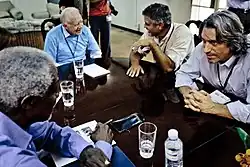 Prendergast in South Sudan during the Southern Sudanese independence referendum, 2011, with Kofi Annan, Jimmy Carter, and George Clooney