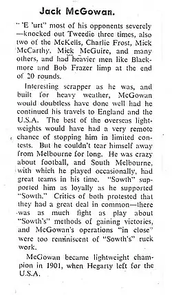 Another source of income for McGowan when not boxing was appearing and touring with the Bland Holt Dramatic Company. He would take part in novelty sporting exhibitions which were written into the plays. In Sporting Life he gave demonstrations of scientific boxing with another lightweight, played on at least one occasion by his brother Archibald McGowan, an amateur lightweight champion himself.[2][3][4]