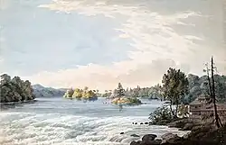 A wooden fort on rapids, believed to be Fort Coteau-du-Lac around 1791