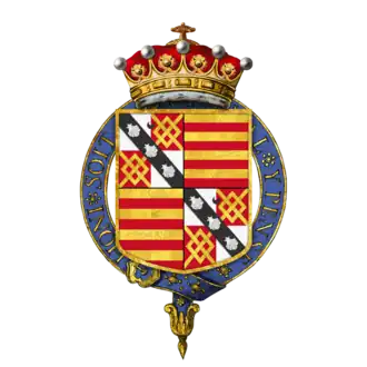 Quarterly 1st and 4th quarterly Argent and Gules a fret Or overall on a bend Sable three escallops of the first a crescent for difference in centre chief Sable (Spencer); 2nd and 3rd barry of eight Or and Gules (Poyntz)