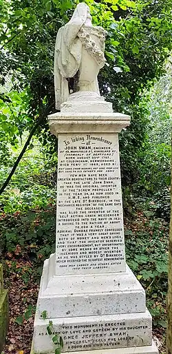 Swan is buried in Abney Park Cemetery and his memorial is listed for preservation as Grade II.[3] His inscription reads:[3]