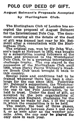 - ^ "Polo Ponies Sail To-Day. Will Be Used in the International Match at Hurlingham. The Pick Of Six Stables. Twenty-four in All, Furnished by Gould, Mackay, Cowdin, Agassiz, and "Larry" Waterbury". New York Times. 11 January 1902. Retrieved 5 April 2011.