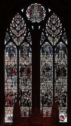 In 1907 the competition to design the first stained glass windows for Liverpool Cathedral was won by Powell's, and Brown was commissioned to design them. The first part of the cathedral to be built was the Lady Chapel and, as the chapel was dedicated to St Mary, the designs reflect the part that women have played in the history of Christianity.[3] On the staircase leading from the chapel to the main body of the cathedral are windows known as the 'Noble Women' windows that honour the contribution of women to society.[4] In 1921 Brown went on to design the large east window of the cathedral, which rises above its reredos.[a] The design of the window is based on the theme of the Te Deum laudamus, with the risen Christ at the top, and below are four windows each representing one of the communities praising God.[5]