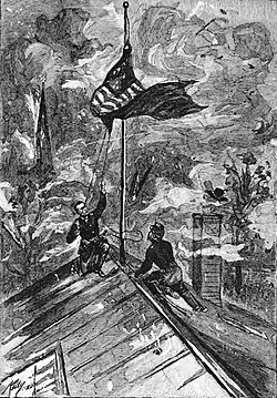 Upon his return, he joined the staff of Brigadier General George F. Shepley, commanding the military district of Norfolk.[9] When General Shepley was assigned as Chief of Staff to the XXV Corps commanded by Major General Godfrey Weitzel, de Peyster became an aide to Weitzel, and eventually his chief of staff.[9] The unit de Peyster had originally joined, the 13th New York, was also assigned in the XXV Corps. He is credited with raising the first Union flag over the Confederate capitol of Richmond, Virginia, after its fall.[a][11][12][13][14] The flag was the same one that had been raised over the city of New Orleans, Louisiana, after its fall.[15] Shepley had been the military Governor of New Orleans, and later the State of Louisiana while it flew there.[6]