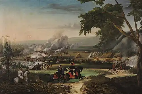 The Battle of the Palo River began at 5 am on July 5, 1815, when a column of royalist troops crossed the Palo river through a ford below the "Pasó Real" to avoid patriot defenses and attack their right flank.[47] The two patriot units positioned in advance along the river, the Popayán and Cauca battalions, detected this movement and alerted the rest of the troops. The army swiftly assembled and prepared for battle. While the advanced units withdrew in an organized manner, Cabal assumed command of the Cundinamarca battalion on the left. He positioned Montúfar in the center with the Socorro battalion, accompanied by the three artillery pieces. On the right flank, Serviez commanded the Antioquia battalion.[48]