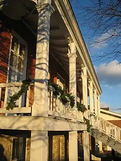 The two-story brick structure is supported by a fieldstone foundation and still features its original front porch. The porch spans the length of the building's front (south) facade, at a height of about 6 ft (2 m).[5] The porch is supported by four wooden pillars, which rest on stone bases. The stairs leading to the front porch are supported by two similar wooden posts, which, like the house, are set into fieldstone bases. The first step on the stairs was originally a limestone block embedded in the ground.[4] The porch roof is supported by six wooden, bracketed pillars. The pillars are simple, with the brackets coming from the boxed capitals. At the rear of the porch wooden pilasters set at each end help to support the roof. Differentiating the home from the traditional French Colonial design is the porch roof, which is separate from the main roof.[4]