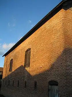 The east bay of the barn contains an animal stall in its northeast corner and a fully enclosed office in its opposite corner. The second-floor hayloft is supported by the two massive transverse beams.[14] The full-sized loft is accessible via an enclosed staircase against the south wall. The building's exterior roof is fully supported by the brick walls. The result is a loft which is an entirely open space save for some pole and beam construction supporting the laminated beams, which act as tie rods at the base of the roof.[14] The barn roof is a common gable roof pitched at a 45 degree angle, it was originally covered with wooden shingles, those have been replaced over the years with asphalt.[14]