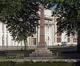 The young explorer was mourned widely, and £2,000 was raised by a Royal Geographical Society committee – chaired by Sir Roderick Murchison – after his death, of which £500 went towards a granite memorial obelisk, designed by Philip Hardwick and unveiled in 1855, in his memory on the Thames riverside, in front of Greenwich Hospital.[2][3] The remainder of the money went towards supporting his five sisters.[3] A nearby Greenwich street, Bellot Street SE10, also carries his name. In 1935, an impact crater on the Moon, on the edge of the Sea of Fecundity, was named Bellot in his honour.[4][5]