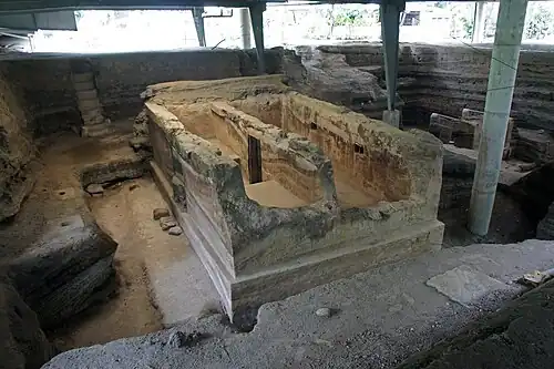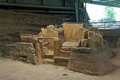 Structure 10 is a multi-roomed structure with many corridors.[19] Archaeologists interpret Structure 10 as being used for community festivals in the Classic Maya period, based on features associated with ceremonial activities.[20] Inside Structure 10 was a north corridor for food preparation, while the east corridor stored several vessels.[21] For instance, decorated vessels and a red painted deer and twine headdress was recovered in Structure 10, which has been interpreted by archaeologists as connected with fertility and harvest rituals.[22] Vessels filled with achiote seeds, found in associated with ceremonial objects suggest that the eruption may have interrupted a ceremony.[19] Additionally, archaeologists propose that a north corridor for used for food preparation, while the east corridor may have been used for storage.[21]