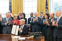 Following the 2016 election, the federal defendants filed a response to the plaintiff's complaint on January 13, 2017, one week before President Obama left office.[18] In their response, the federal defendants denied that they had caused climate change or specific climate change impacts such as increased temperatures, drought conditions, warmer water temperatures, rising sea levels, and ocean acidification.[19] About a month later, the complaint was amended to make the lead defendant newly elected President Donald Trump.[19] In the months that followed, the fossil fuel industry groups requested that they be removed from the case, believing that the Department of Justice under the Trump Administration would vigorously defend the case, unlike the Obama Administration.[14] The National Association of Manufacturers, one of the fossil fuel groups, said that "as the dynamics have changed over the last several months, we no longer feel that our participation in this case is needed to safeguard industry and our workers".[14][15] In late June 2017, Judge Coffin released the fossil fuel industry defendants from the case, as well as establishing a trial date on February 5, 2018, before Judge Aiken.[20]