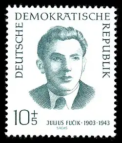 Julius Fučík (Czech: [ˈjulɪjus ˈfutʃiːk]) (23 February 1903 – 8 September 1943) was a Czech journalist, critic, writer, and active member of Communist Party of Czechoslovakia. For his part at the forefront of the anti-Nazi resistance during the Second World War, he was imprisoned and tortured by the Gestapo in Prague, and executed in Berlin. While in prison, Fučík recorded his interrogation experiences on small pieces of paper, which were smuggled out and published after the war as Notes from the Gallows. The book established Fučík as a symbol of resistance to oppression, as well as an icon of communist propaganda.