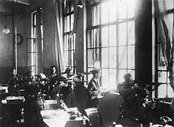 Popular resistance to the coup was coordinated from the Teatre Principal, where defense committees liased with each other and with the Catalan Regional Committee of the CNT, which had occupied the Casa Cambó on Via Laietana.[117] The POUM also occupied part of the Teatre Principal, establishing a first aid station in its lobby.[121] The Barcelona defense committee kept in contact with militias on the Avinguda del Paral·lel through El Raval,[122] and with those on the Pla de Palau through the Gothic Quarter; gaining control of these areas would mark the turning point of the battle.[117]