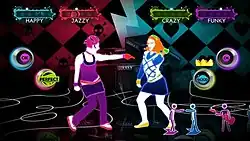 Like the previous games in the Just Dance main series, up to four players can play to mirror on-screen dance choreography from many different songs, as they are judged on their ability to follow a dance routine to a chosen song. Returning features in the game include Non-Stop Shuffle, Speed Shuffle, Simon Says, Shout Out, Just Sweat and Just Create (Xbox 360 only).