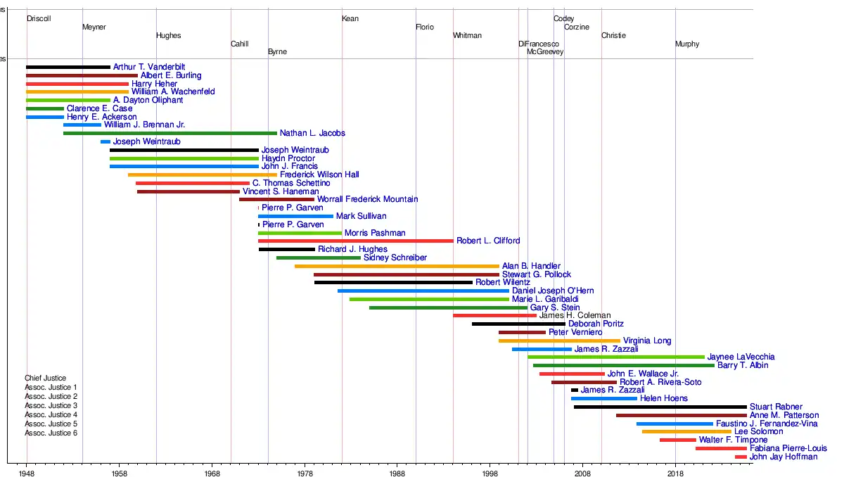 John Jay HoffmanFabiana Pierre-LouisWalter F. TimponeLee SolomonFaustino J. Fernandez-VinaAnne M. PattersonStuart RabnerHelen HoensJames R. ZazzaliJohn E. Wallace Jr.Barry T. AlbinJaynee LaVecchiaJames R. ZazzaliVirginia LongPeter VernieroDeborah PoritzGary S. SteinMarie L. GaribaldiDaniel Joseph O'HernRobert WilentzStewart G. PollockAlan B. HandlerSidney SchreiberRichard J. HughesRobert L. CliffordMorris PashmanPierre P. GarvenMark Sullivan (judge)Pierre P. GarvenWorrall Frederick MountainVincent S. HanemanC. Thomas SchettinoFrederick Wilson HallJohn J. FrancisHaydn ProctorJoseph WeintraubJoseph WeintraubNathan L. JacobsWilliam J. Brennan Jr.Clarence E. CaseA. Dayton OliphantWilliam A. WachenfeldHarry HeherAlbert E. BurlingArthur T. Vanderbilt
