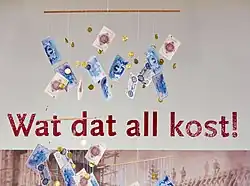 Other objects include Cologne's historical Ratssilber, textiles, and since 1985 also increasingly current and contemporary art, such as a painting of Cologne Cathedral by Andy Warhol. In addition, gaps were filled in the area of everyday history and everyday life, the subject of guest workers was approached[22] and thus increasingly the present, from whose everyday culture objects are regularly taken into the collection. Examples of this are a printed kippa from the visit of Pope Benedict XVI to the Synagogen-Gemeinde Köln in 2005, a German flag from the 2006 FIFA World Cup or costumes from the Cologne studios of the TV Series Lindenstraße. Equally, however, there is also evidence of more serious events from Cologne's recent past: a flag from the election campaign stand where the assassination attempt on Henriette Reker was carried out, the notebook of a refugee from Syria with plans for the reconstruction of his house, and finally a surgical mask worn in the Cologne city council during the COVID-19 pandemic.[47]
