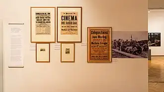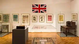 Ewald's basic museum concept fitted into the National Socialist, völkisch propaganda strategy, as a result of which it finally received unexpected support from the new rulers after years of pressure from Lord Mayor Adenauer – after the latter had already been dismissed from office in March 1933. The Political Department planned by Ewald in 1933 could not be realised until the opening; he initially limited himself to the Representation of the National Socialist Movement in the Rhineland, which corresponded to the National Socialist minimum requirement for a museum of local history.[11] However, this too was not complete by the time of the opening.[12] In the following years, the exhibition became increasingly political and the museum policy more opportunistic,[16] which was reflected in propaganda exhibitions such as "Das wehrhafte Deutschland" (1936), "Volksgemeinschaft – Wehrgemeinschaft" (1937). However, these special exhibitions were only partly curated by the museum itself; for the most part, the museum merely provided the rooms for exhibition organisers from various organisations.[12]