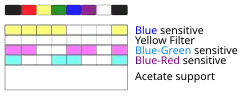 The blue-green and blue-red sensitive layers are primarily sensitive to green and red light, respectively, but are sensitive to blue light as well. The yellow filter layer is added to prevent blue light from penetrating to these layers during exposure.[1]