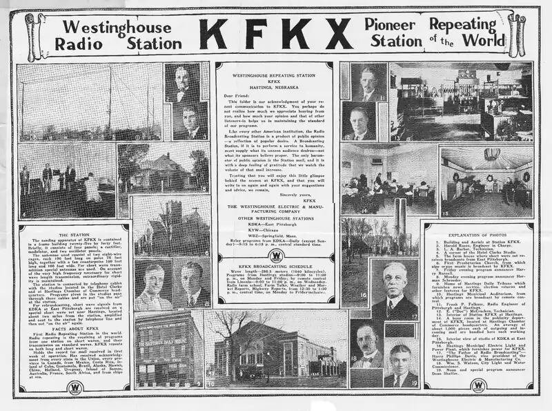 14. ^ "Westinghouse Radio Station KFKX Pioneer Repeating Station of the World", circa 1926 KFKX brochure.