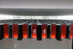 The K computer – named for the Japanese word/numeral "kei" (京), meaning 10 quadrillion (1016)[4][Note 1] – was a supercomputer manufactured by Fujitsu, installed at the Riken Advanced Institute for Computational Science campus in Kobe, Hyōgo Prefecture, Japan.[4][5][6] The K computer was based on a distributed memory architecture with over 80,000 compute nodes.[7] It was used for a variety of applications, including climate research, disaster prevention and medical research.[6] The K computer's operating system was based on the Linux kernel, with additional drivers designed to make use of the computer's hardware.[8]