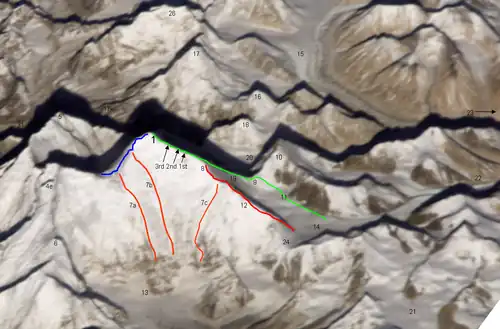 The Kangshung Face (Chinese: 康雄壁) or East Face[1] is the eastern-facing side of Mount Everest, one of the Tibetan sides of the mountain. It is 3,350 metres (11,000 ft) from its base on the Kangshung Glacier to the summit.[2] It is a broad face, topped on the right (when seen from below) by the upper Northeast Ridge, and on the left by the Southeast Ridge and the South Col. Most of the upper part of the face is composed of hanging glaciers, while the lower part consists of steep rock buttresses with couloirs between them. The steep southern third of the Kangshung Face also comprises the Northeastern Face of Lhotse; this section may be considered a separate face altogether following the division of the South "Neverest" Buttress up to the South Col. It is considered a dangerous route of ascent, compared to the standard North Col and South Col routes, and it is the most remote face of the mountain, with a longer approach.