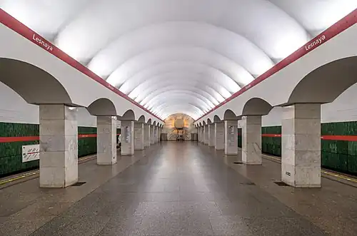 As new and older factories already lemployed many people from around the city and district that had mass housing construction, in 1975 a new stretch of the city's rapid transit system's red Line One was added from the north with a station in the street. The station was named Lesnaya after the neighborhood and a nearby avenue Lesnoy Prospect that were named after the Forestry Academy the avenue leads to northwards from downtown. The academy, now a university has a large scenic park that has been a local attraction. Correspondingly, the station has green colour in its design.