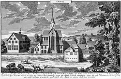 Kappel Abbey is first mentioned in 1185 by Bishop Hermann II of Constance. The abbey was founded by the Freiherr of Eschenbach. The name was derived from a chapel in which, according to a foundation legend, hermits used to live. In 1211, Pope Innocent III gave the monastery the Privilegium commune Cisterciense. Between the 13th to 15th centuries the Abbey received several Imperial and Royal privileges.[1]