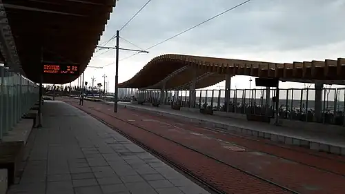 Karantina is a light rail station on the Konak Tram line in İzmir, Turkey. It is located within the 15 Temmuz Demkorasi Şehitleri Square in east Konak, above the Mustafa Kemal Coastal Boulevard as the throughway passes underneath the square.[1] The station was originally named Mithatpaşa Lisesi from the historic Mithatpaşa high-school, located one block south of the station.