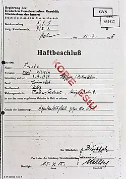 The enemy activities of Fricke are that he obtained from persons in the German Democratic Republic documents and materials about leading Party Officers, leaders in the economy and of industry. [...] Furthermore, Fricke writes articles for the West German press. The purpose of arresting him is to identify and learn the methods by which our enemy sometimes succeeds in getting hold if the above mentioned items.[13]