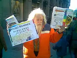 ![]() Kauko Nieminen selling his works on the street | |