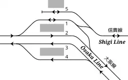 Kawachi-Yamamoto Station has a side platform serving Track 5 in the north, and two island platforms serving Tracks 1, 2, 3 and 4 in the south, all connected by an elevated station building.