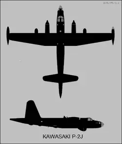 The Kawasaki-built P-2J (originally P2V-Kai, where "Kai" (改) means modification) was the last version of the Neptune to be produced. Work on the P-2J was begun in 1961.[1] The first P-2J, converted from a P2V-7 (P-2H) performed its initial flight on 21 July 1966, and the last of a further 82 production P-2Js was delivered in March 1979.[2]