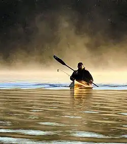 Kayak fishing is fishing from a kayak, a type of light human-powered watercraft propelled by handheld double-paddles or pedalled fins/propellers. Recreational rod angling is the predominant form of kayak fishing, although other fishing techniques such as handlining, netting, trapping, spearing, snagging or even shooting can also be used.