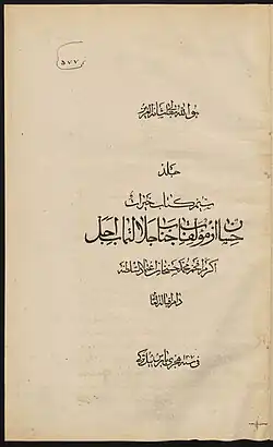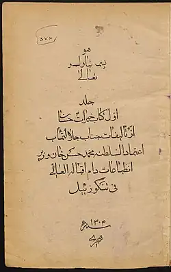 Khayrat-é Hésan (Persian: خیرات حسان; lit. Fairest Women) is a comprehensive biographical encyclopedia of prominent women in the Islamic world,[1] written in Persian and compiled in three volumes by Mohammad Hasan Khan Maraghe’i, known as E'temad os-Saltaneh (died 1895).[2][3] A notable writer and politician of the Qajar era, E'temad os-Saltaneh organised this work alphabetically and documented the lives of distinguished women from the early Islamic period to his own time.[4] Due to its writing style, use of varied sources, and comprehensiveness, this work is considered one of the most significant historical records of its kind.[5]