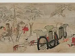 The Kibi Daijin Nittō Emaki originally consisted of a single scroll 32 cm (13 in) high by 2,440.8 cm (960.9 in) long, the longest single scroll ever known, before being separated into four parts.[2][3] It dates from the second half of the 12th century (end of the Heian period (794–1185) or early Kamakura period (1185–1333)), when a renewed interest in the narrative subjects and life of the people was reflected in the topics of contemporary emakimono.[4][5]