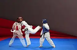 A flying kick, in martial arts, is a general description of kicks that involve a running start, jump, then a kick in mid-air.[21] Compared to a regular kick, the user is able to achieve greater momentum from the run at the start. Flying kicks are not to be mistaken for jumping kicks, which are similar maneuvers. A jumping kick is very similar to a flying kick, except that it lacks the running start and the user simply jumps and kicks from a stationary position.[22] Flying kicks are often derived from the basic kicks.[23] Some of the more commonly known flying kicks are the: flying side kick, flying back kick and the flying roundhouse kick, as well as the flying reverse roundhouse kick.[24] Flying kicks are commonly practiced in Taekwondo, Karate, Wushu and Muay Thai for fitness, exhibitions and competition. It is known as tobi geri in Japanese martial arts and twyo chagi in Taekwondo.