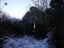 Overall site measures about 38 by 22 metres (including the church). Prone to overgrowing weeds and branches, it lies close to a tree-covered crossroads. The oldest burial identified here is from 1716 which could well have been after the church was closed down. The burial ground is mentioned as being used by Protestants as well as Catholics and its likely Church of Ireland chiefly used it during Penal times.[12] The array of monuments here include headstones, some of which are set in the old church interior, chest-tombs and vaults. The most prominent of these vaults is a Catholic grave being the family Mausoleum erected by a local merchant Morgan McDonagh in 1822. It's chiefly made of limestone with a pitched roof, also made of stones, and features an opening in one wall filled with a large stone plaque containing carved dedication text.[13]