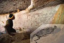 The changing and expanding complexity of styles and techniques has caught the attention of many, paving the way for mass amounts of archaeological and anthropological research. Much of the artwork in the area has been gone over with similar or alternative methods to preserve the art, add to it, or enhance it.[24] Rock shelters are some of the best locations for preservation.[25] The oldest category known as the Irregular Infill Animal or the Naturalistic period is responsible for the region's life-size animal depictions.[26] A rock shelter in Kimberley's northeastern territory is home to a perfect example of this, a two-meter-long kangaroo painting on the ceiling. This case was extremely rare as archaeologists found remains of mud wasp nests that could be used for dating. These nests were located both below and on top of the painting making them prime for determining an accurate age of the kangaroo art itself. They analysed samples from 6 of the nests and settled on a date between 17,500 years old and 17,100 years old, making the kangaroo rock art the oldest in Australia.[26][27]