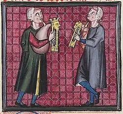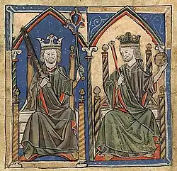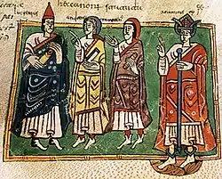 Miro, king of Galicia, and Martin of Braga, from an 1145 manuscript of Martin's Formula Vitae Honestae,[18] now in the Austrian National Library. The book was originally dedicated to King Miro with the header "To King Miro, the most glorious and calm, the pious, distinguished for his Catholic faith"