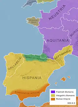 Political map of southwestern Europe around the year 600, which referred to three different areas under Visigothic government: Hispania, Gallaecia, and Septimania.