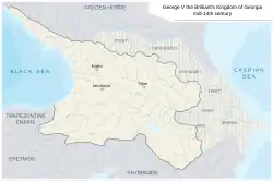 The Kingdom of Georgia (Georgian: საქართველოს სამეფო, romanizedSakartvelos samepo), also known as the Georgian Empire,[9] was a medieval Eurasian monarchy that was founded in c. 1008 AD. It reached its Golden Age of political and economic strength during the reign of King David IV and Queen Tamar the Great from the 11th to 13th centuries. Georgia became one of the pre-eminent nations of the Christian East, and its pan-Caucasian empire[10] and network of tributaries stretched from Eastern Europe to Anatolia and northern frontiers of Iran, while Georgia also maintained religious possessions abroad, such as the Monastery of the Cross in Jerusalem and the Monastery of Iviron in Greece. It is the principal historical precursor of present-day Georgia.