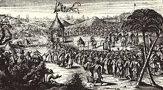 The Taiwanese aboriginal tribes who were previously allied with the Dutch against the Chinese during the Guo Huaiyi rebellion in 1652 turned against the Dutch during the siege and defected to Zheng's Chinese forces.[34] The aboriginals of Sincan defected to Zheng after he offered them amnesty. The Sincan aboriginals then proceeded to work for the Chinese and behead Dutch people in executions. The frontier aboriginals in the mountains and plains also surrendered and defected to the Chinese on 17 May 1661, celebrating their freedom from compulsory education under the Dutch rule by hunting down Dutch people and beheading them and trashing their Christian school textbooks.[35]