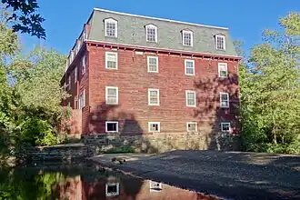 In 1683, Henry Greenland built the first tavern here for travelers between New York City and Philadelphia. The current Kingston Mill, also known as the Kingston Gristmill, was built in 1888, the third one at this site. In 1755, Jacob Skilman built a gristmill and sawmill here on the Millstone River. The mill was burned in 1776 by the British Army during the American Revolutionary War.[4] The district also includes the Greenland–Brinson–Gulick farm, four nearby houses, and the Kingston Bridge, an 18th-century stone arch bridge over the river. It was one of the first settlements in Princeton, preceded only by the Quaker community along the Stony Brook.[4]