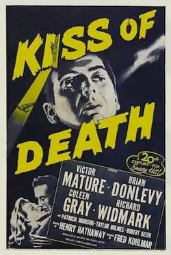 Kiss of Death is a 1947 American film noir directed by Henry Hathaway, written by Ben Hecht and Charles Lederer from a story by Eleazar Lipsky, and starring Victor Mature, Brian Donlevy, Coleen Gray, and Richard Widmark.[4] Set in New York City, the film follows a thief involved in a jewelry heist who begins to give up his accomplices after his wife commits suicide while he is in prison.