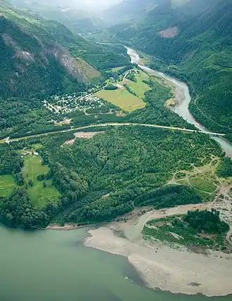 Kitselas is a railway point on the northwestern shore of the Skeena River in the Skeena region of west central British Columbia, Canada.[1] The former name was Vanarsdol. Across the Skeena to the southwest is the mouth of the Zymoetz River (commonly called the Copper River). This river bridge on BC Highway 16 is by road about 10 kilometres (6 mi) northeast of Terrace.