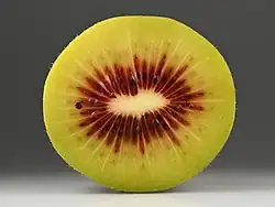 Red kiwifruits are cultivars of Actinidia chinensis var. chinensis, distinguished by their red coloured flesh. Its origin can be traced back to China from a natural mutation of gold kiwifruit found in the wild in 1982,[45] which became the Hongyang variety, China's first commercially viable red kiwifruit cultivar.[27][46] By 2020, Hongyang became the most grown kiwifruit cultivar in China across all types and varieties.[10]
