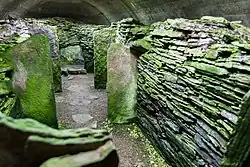 Archaeological excavation during the 1930s revealed a rectangular-shaped cairn measuring 15 m (49 ft) by 8 m (26 ft) externally and situated northwest–southeast. The cairn encloses a burial monument measuring 8 m (26 ft) by 2 m (6 ft 7 in) with a surviving height of 2 m (6 ft 7 in). The roof to the tomb had been removed at some point when the tomb was robbed. The exterior walls of the tomb display decorative stonework which can be seen near the entrance.[4] The original burial chamber contained four compartments separated by pairs of upright slabs. Entrance to the main chamber is through a 4 m (13 ft) passage on the southeast. Excavation uncovered the skeletal remains of at least 29 people, 36 deer, several sheep and a dog. Also found were pottery sherds, four arrowheads, five bone tools and several pieces of flint. Historic Environment Scotland established the site as a scheduled monument in 1994.[2][3]