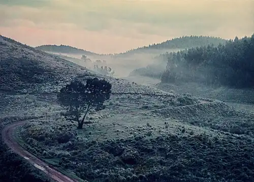 The road originally passed through an area of frost-tolerant shola/montane grassland mosaic interspersed with pockets of stunted shola forests in the valleys. In 1900, 75% of the 385 km2 (149 sq mi) area of the Upper Palni Hills, was grassland.[28] This shola/grasslands ecosystem was effective in conserving monsoon rainfall and letting it soak in to replenish the watertable for year-round release into the streams.[29]