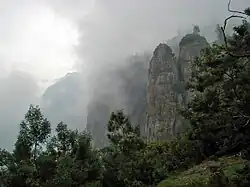 There are several well established side roads and other intersecting minor trails which branch off from the Kodaikanal–Munnar Road. Most of these show as "other trails" on the 1959 Army map.[21] These intersections either go north to Upper Palani Hills villages or go south, dropping sharply down the south facing escarpment to hill villages en route and towns on the plains up to 1,800 m (5,900 ft) below. The Ciff Trail provides an alternate east–west route between Berijam Lake and the Kerala Forest Bungalow. There are over 40 recognized hiking routes from Kodaikanal using the Munnar road and these other trails.[25]